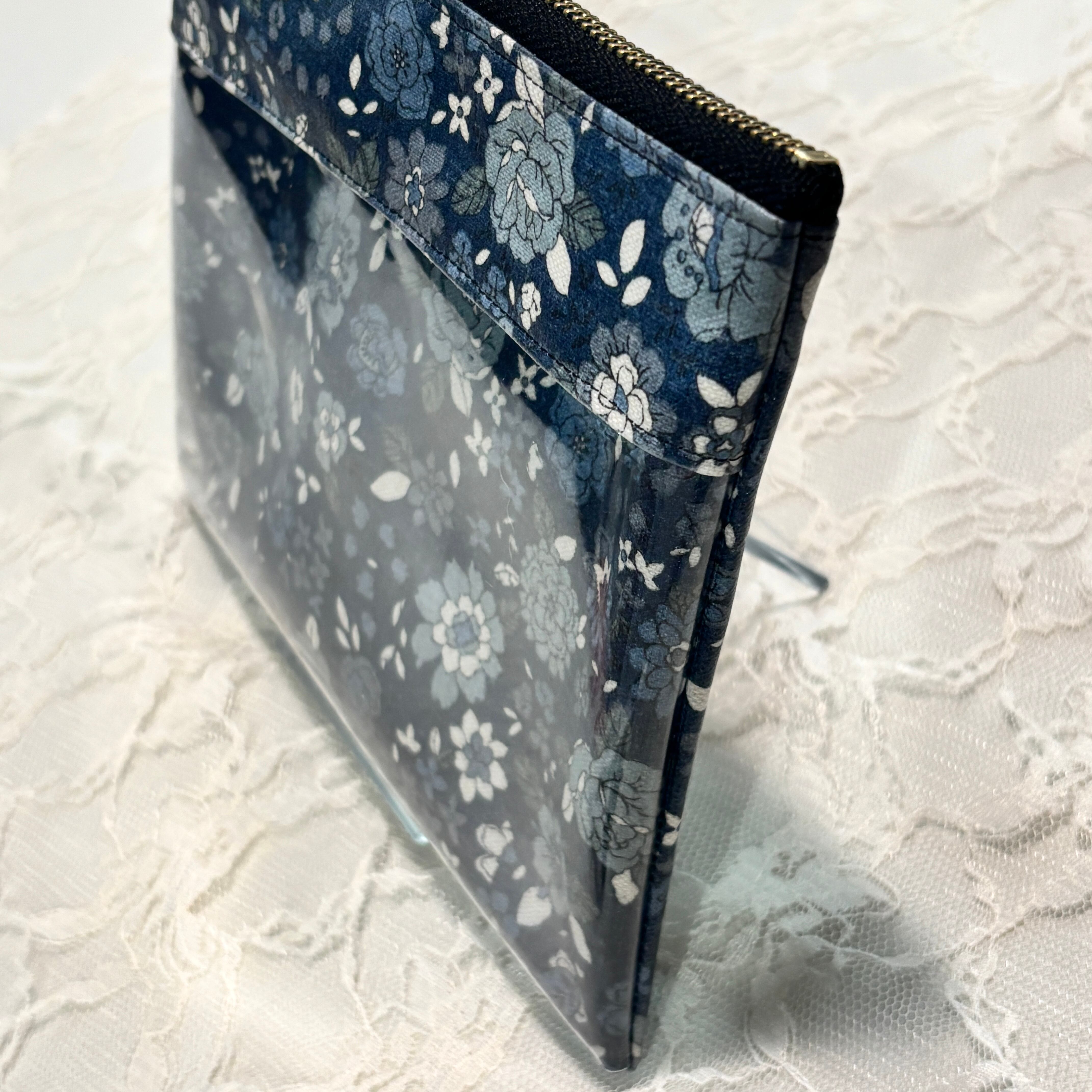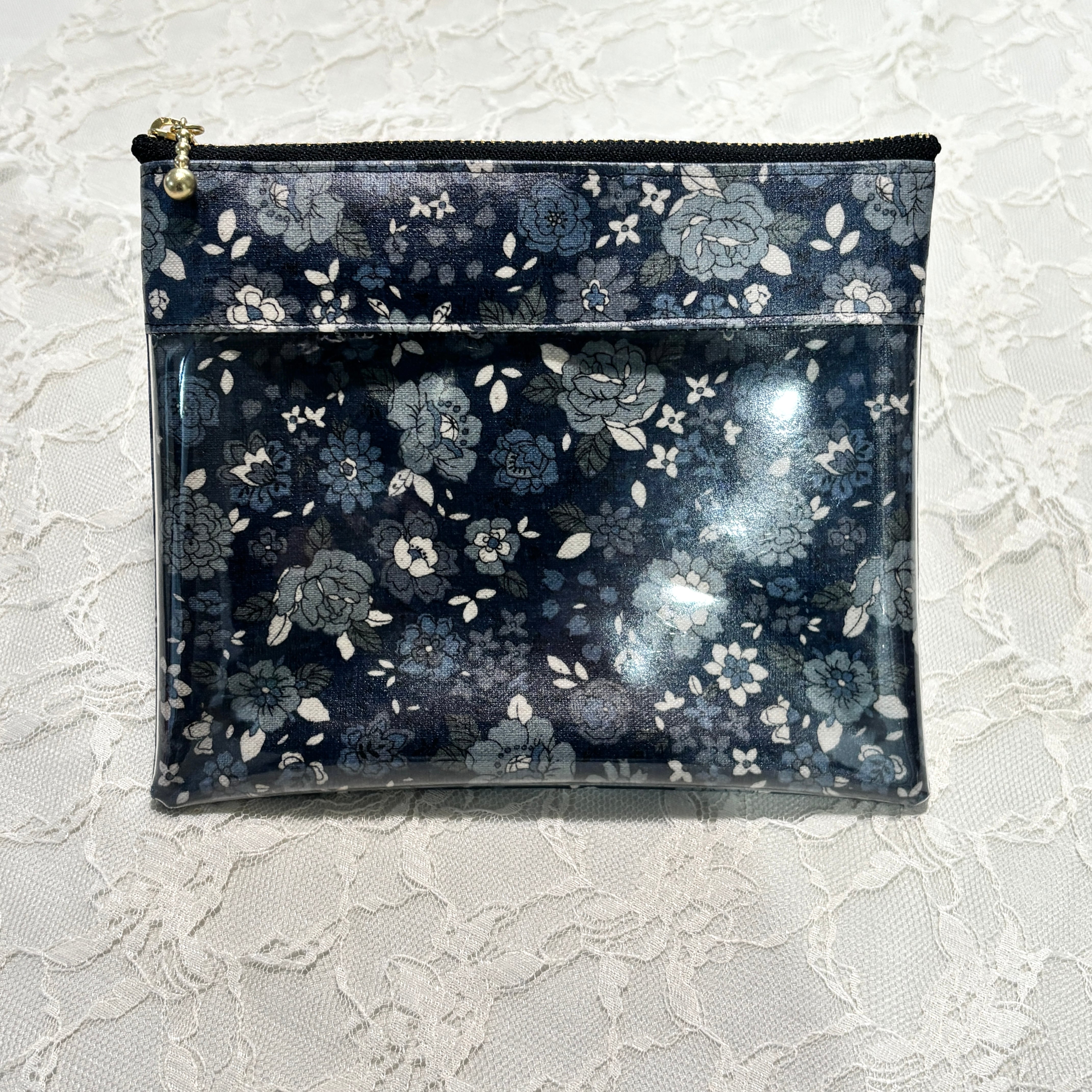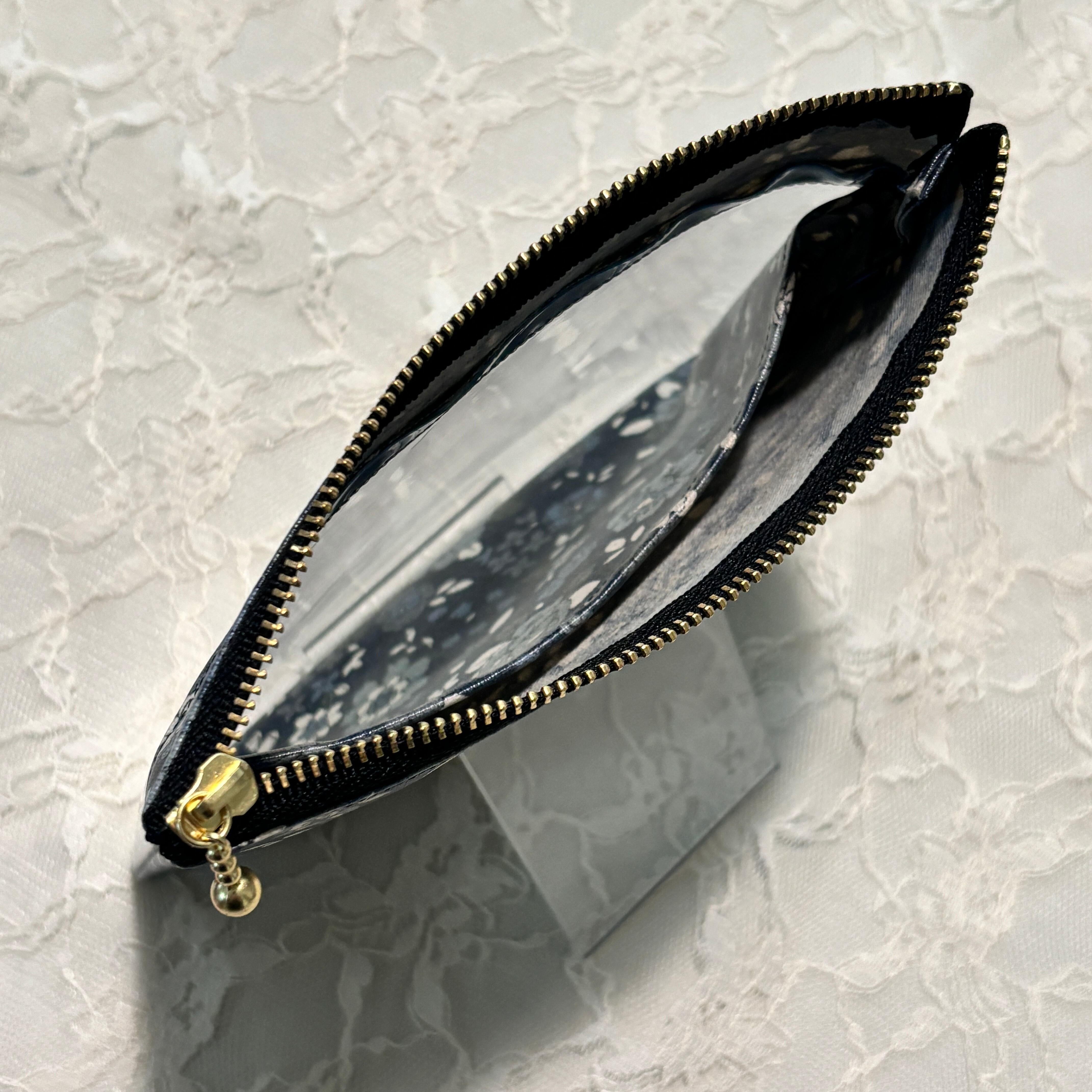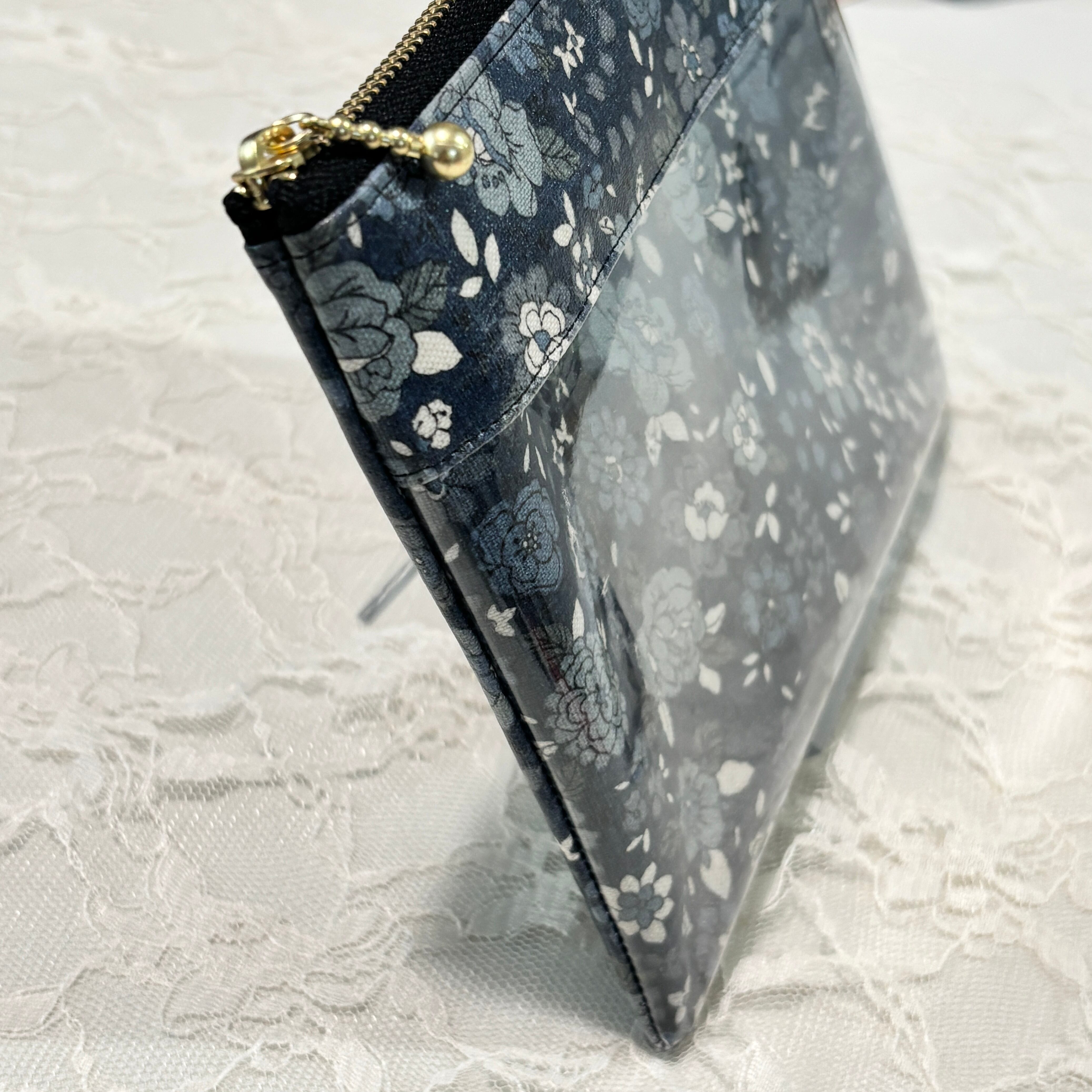 シックなブラックベースの大人っぽい花柄生地に、中身がひと目でわかるクリアポケットを組み合わせたフラットポーチです。