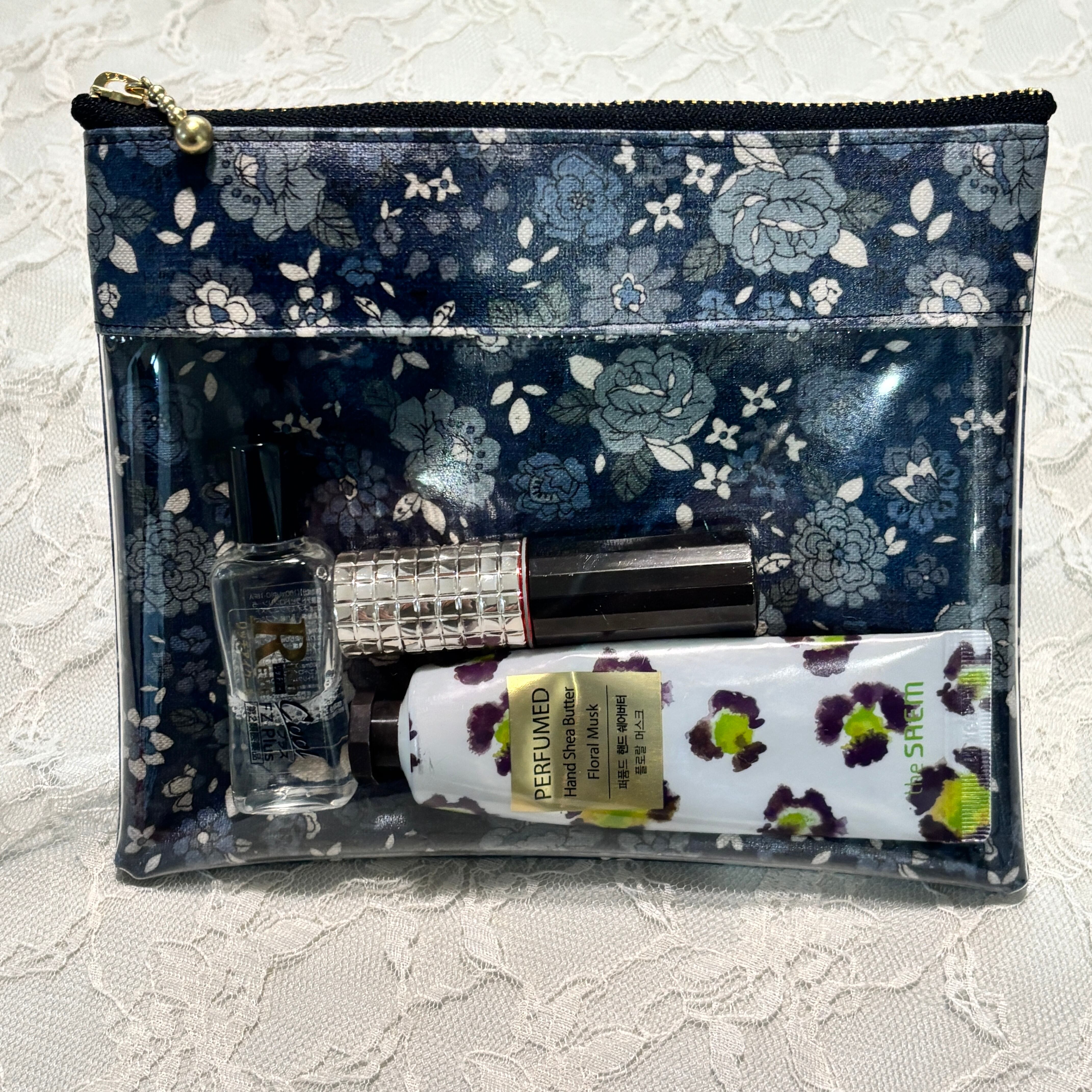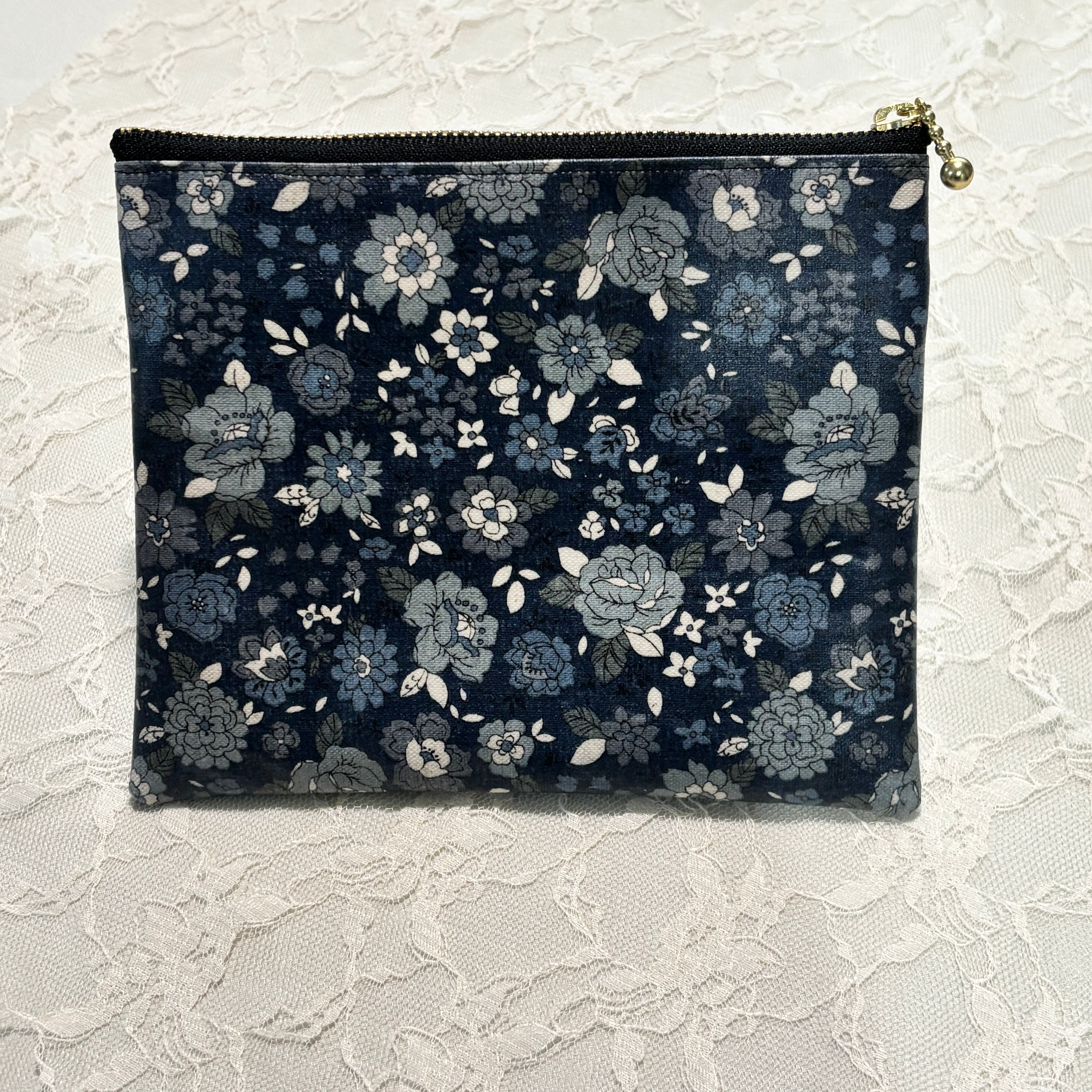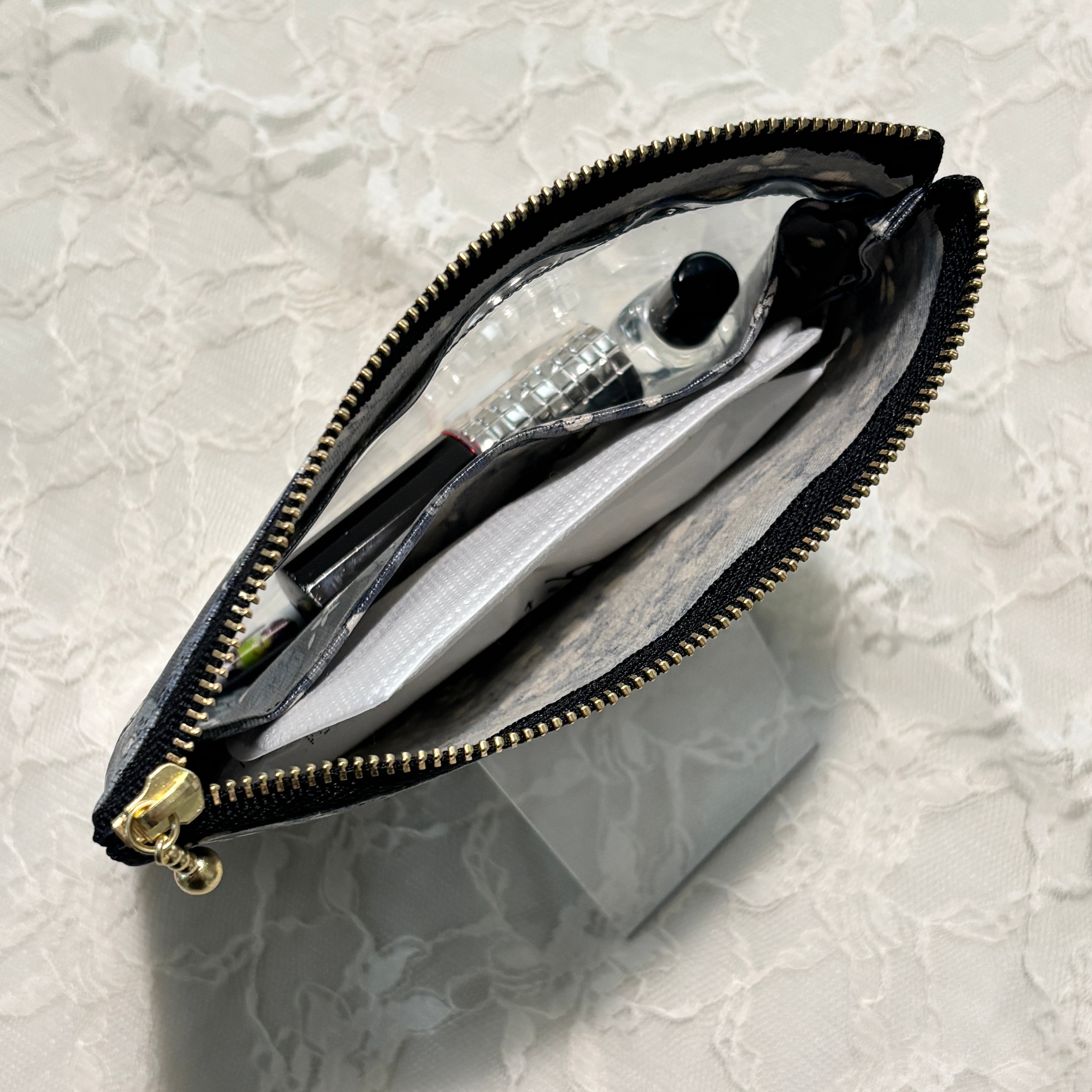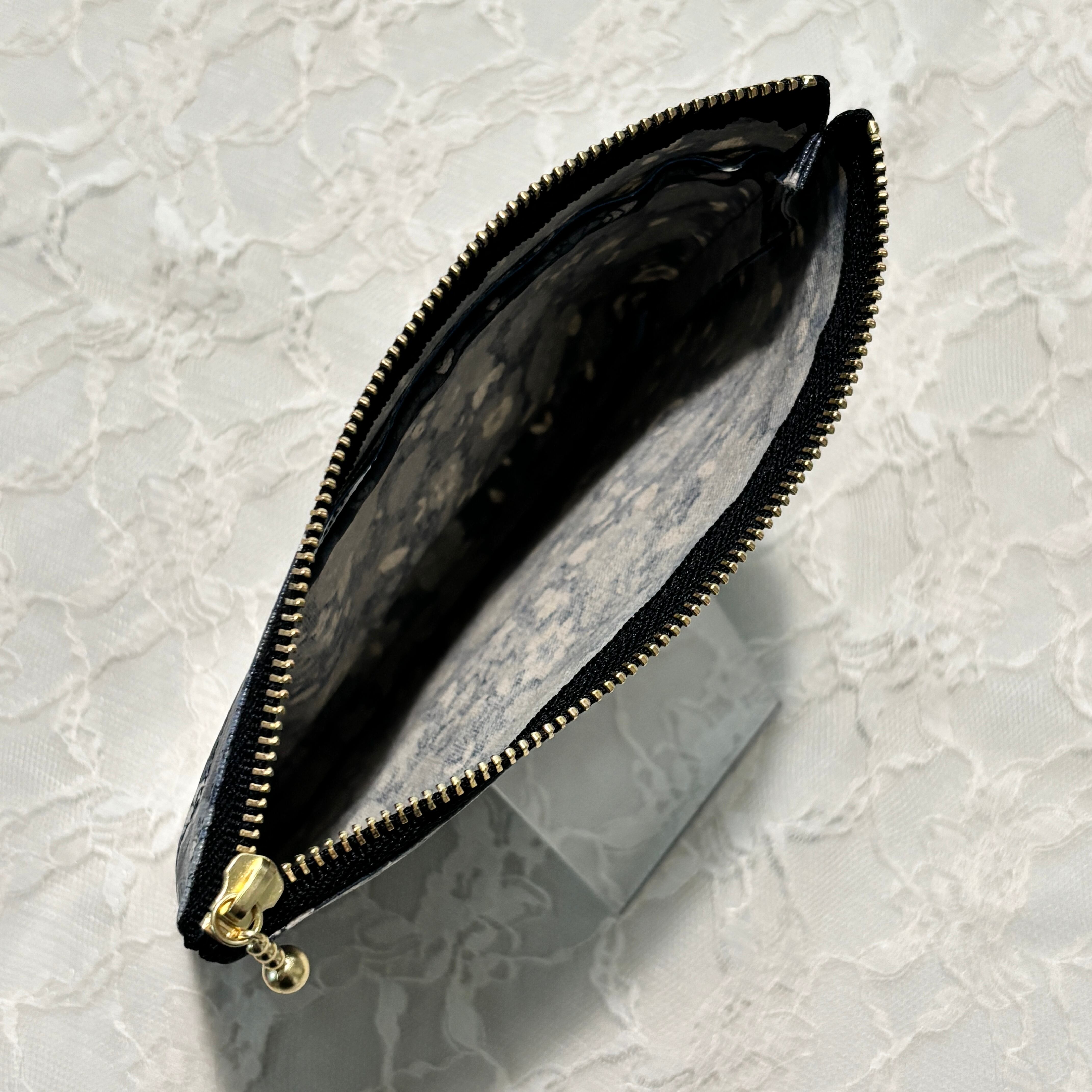 シックなブラックベースの大人っぽい花柄生地に、中身がひと目でわかるクリアポケットを組み合わせたフラットポーチです。