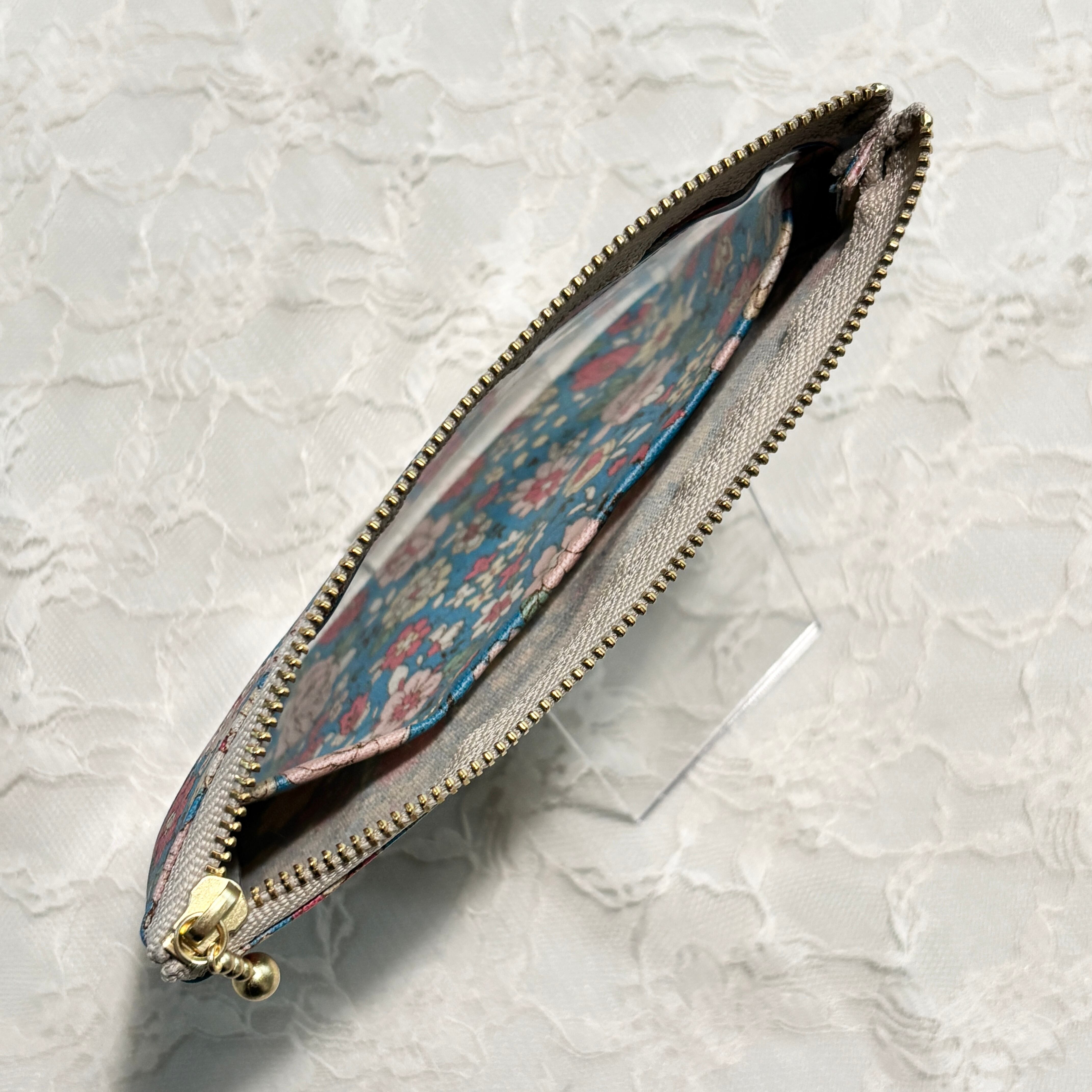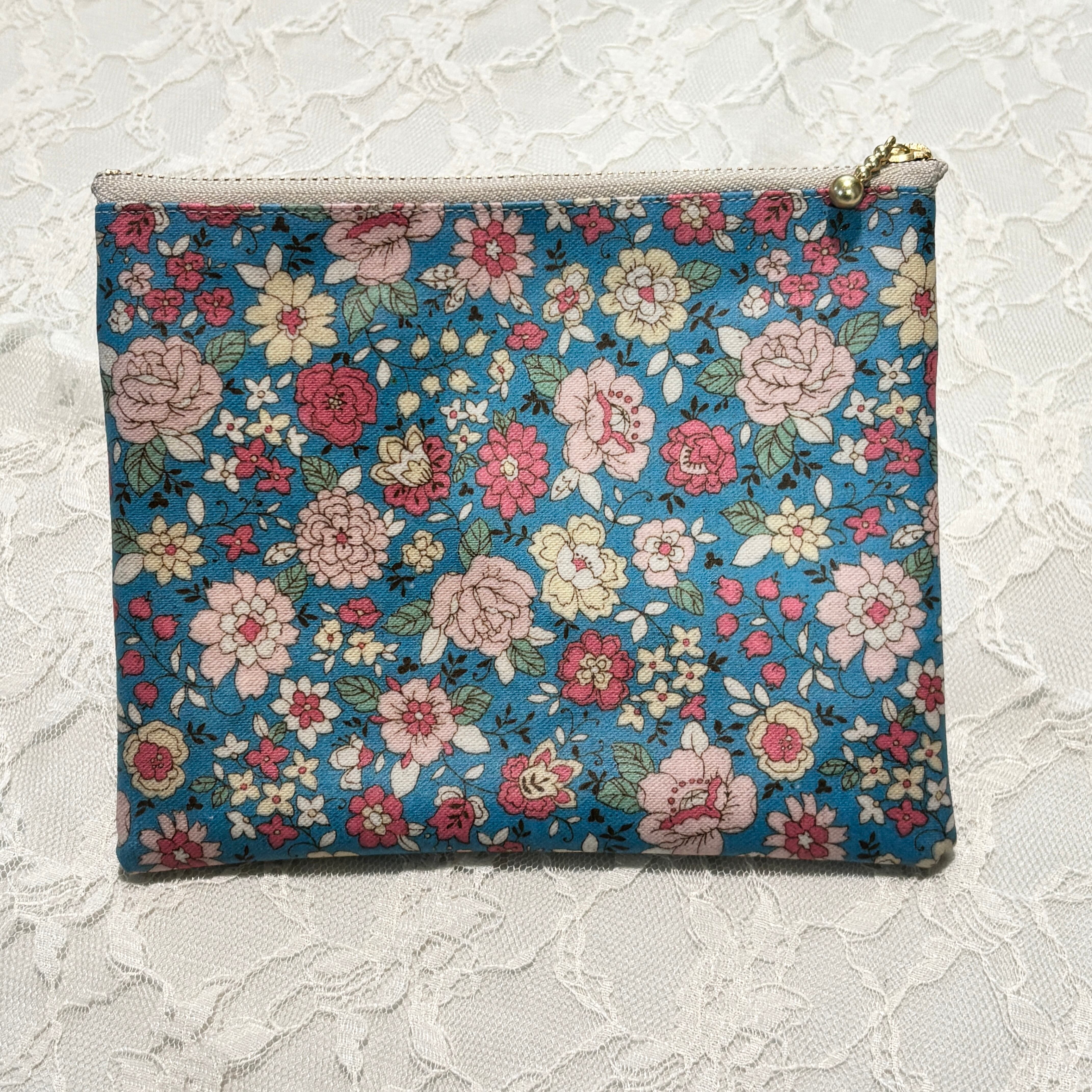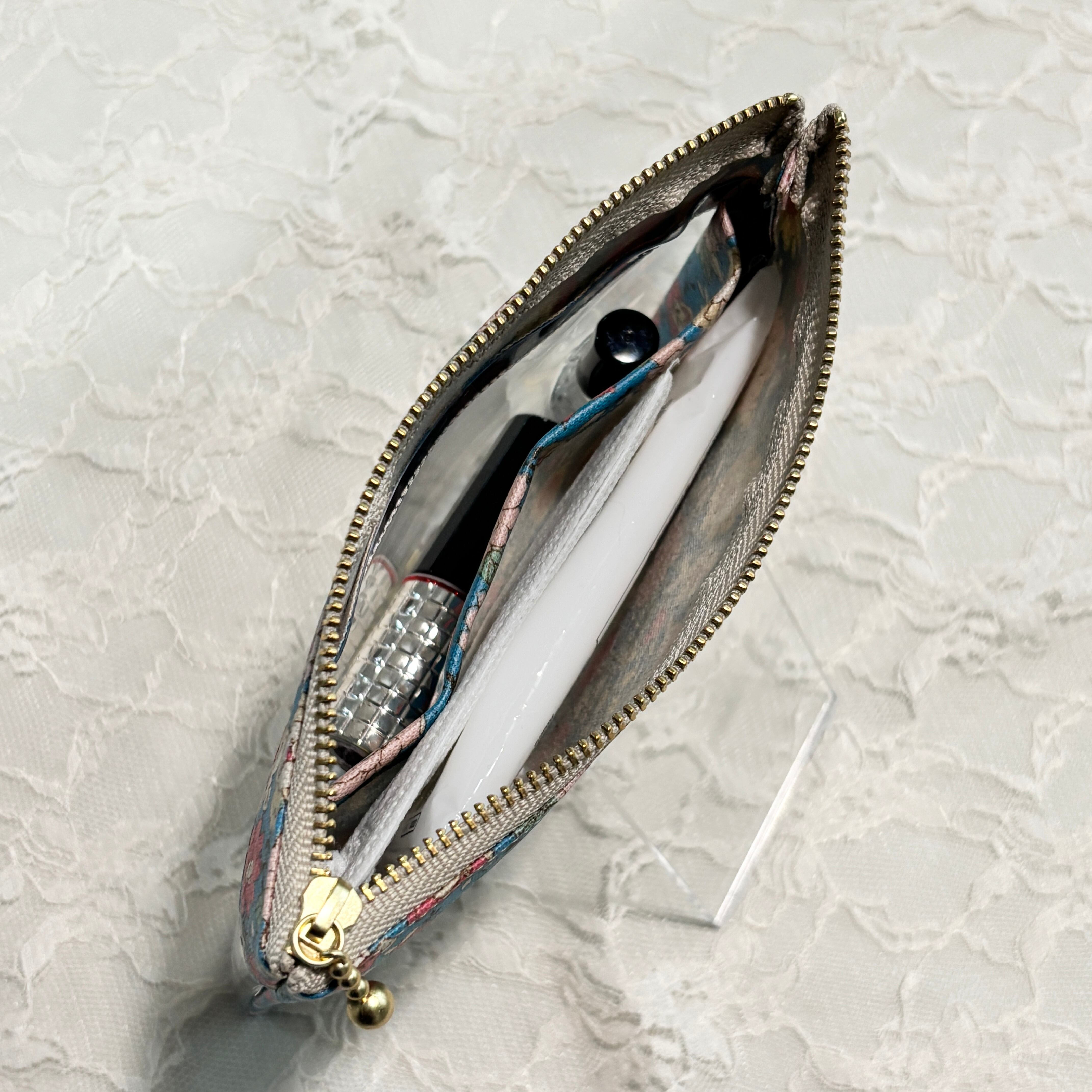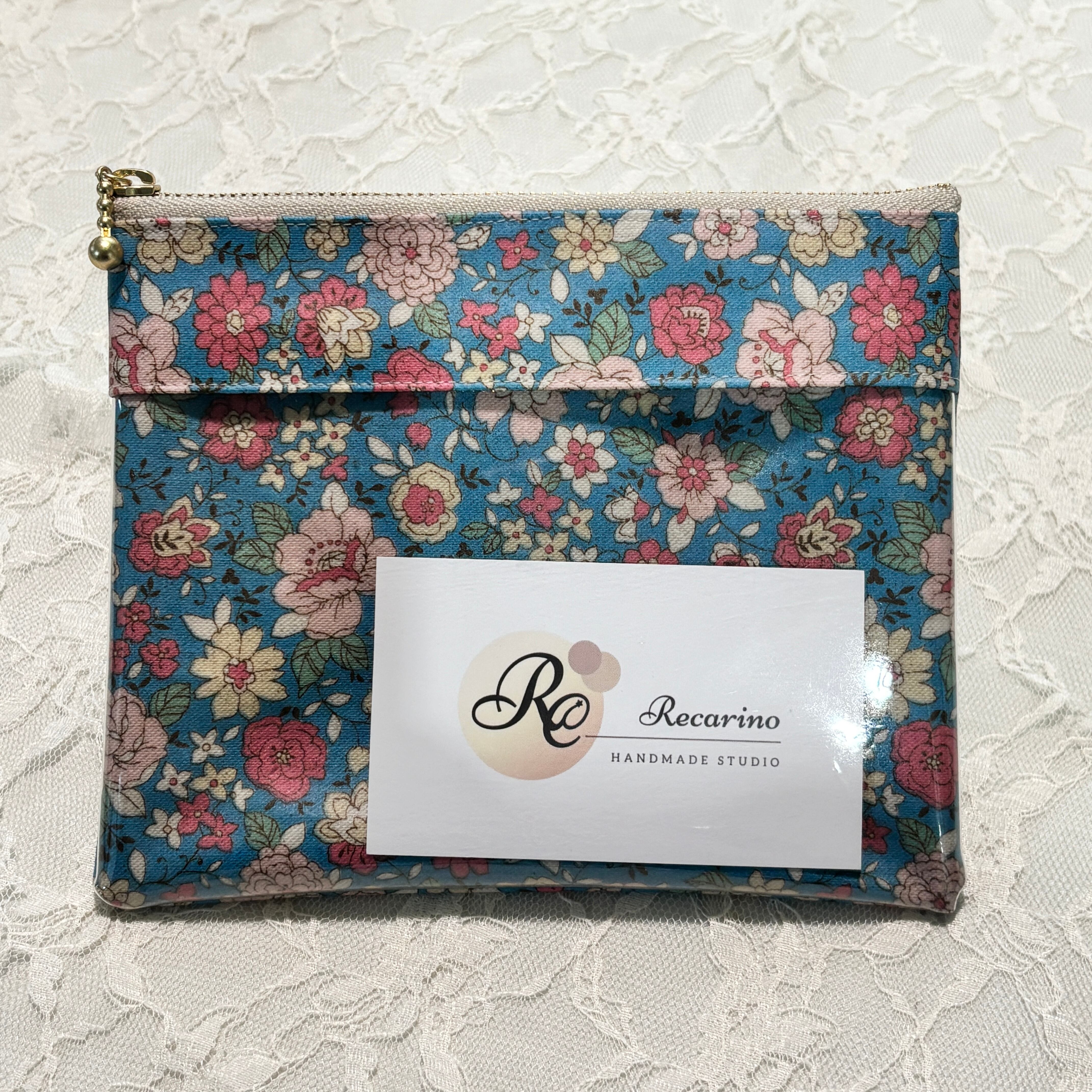 爽やかで凛としたブルーをベースに、可憐なピンクの花々が咲き誇るラミネート生地を使用しました。中身がひと目でわかるクリアポケットを組み合わせた、機能的なフラットポーチです。