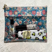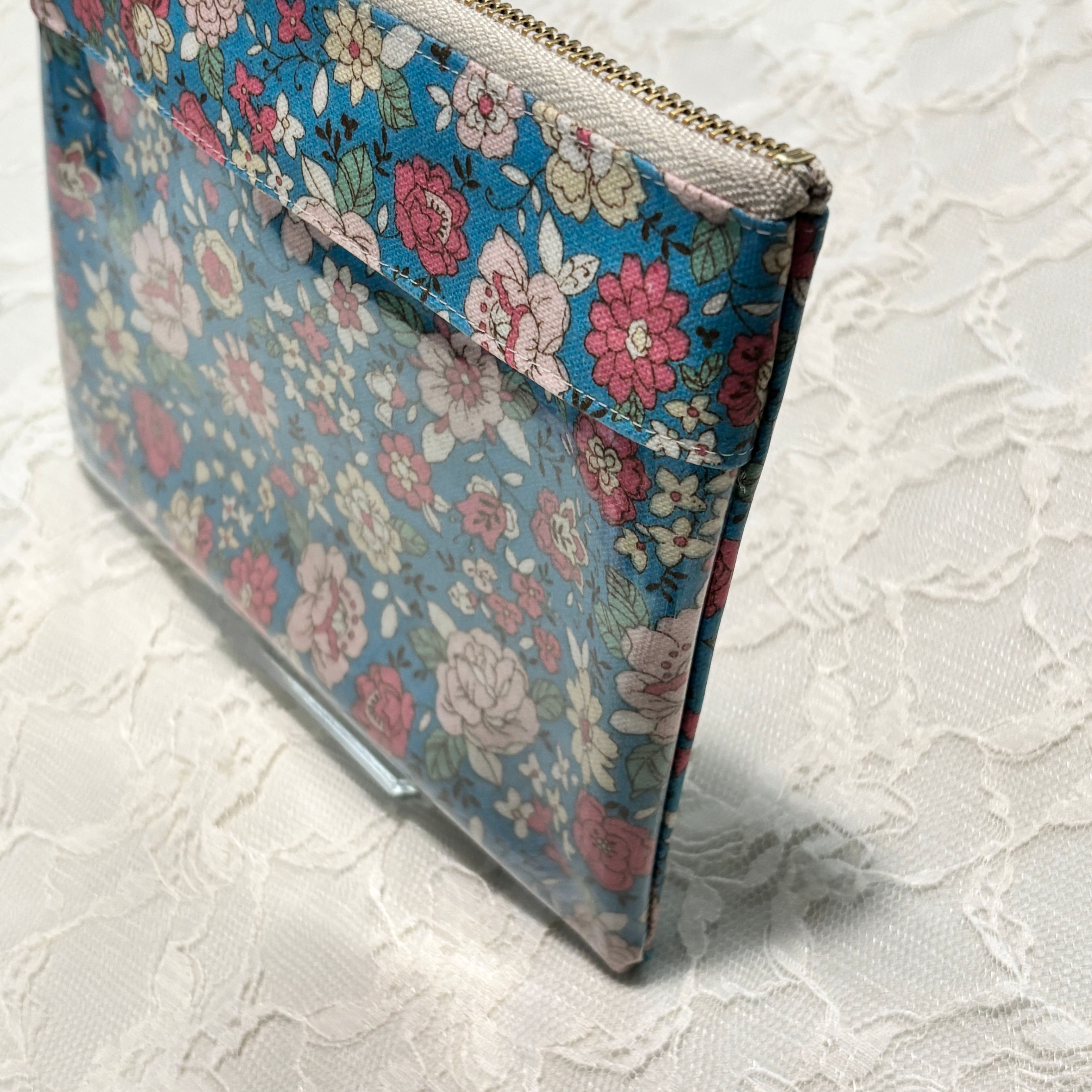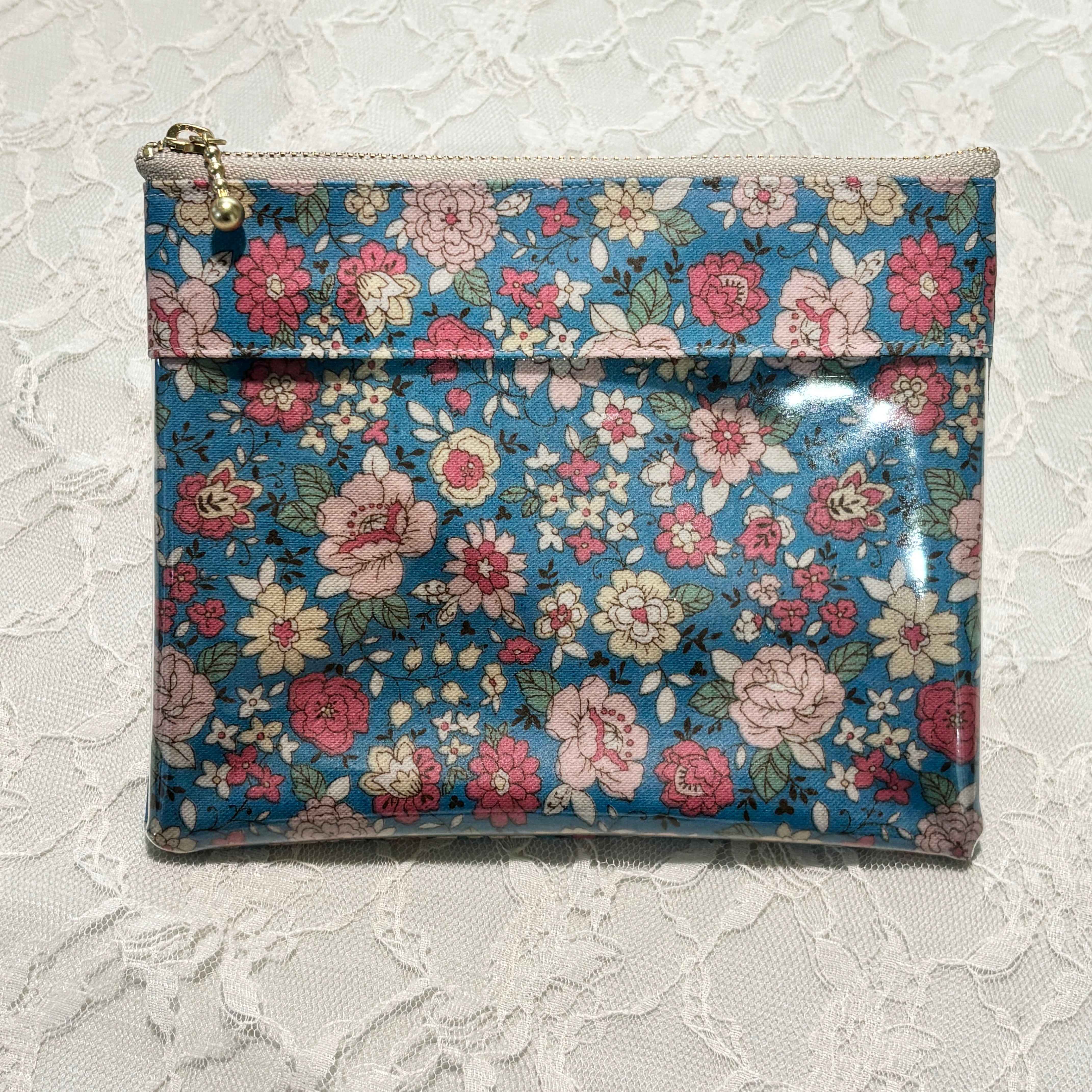 陽だまりのような温もりのあるオレンジの花々が咲き誇るラミネート生地を使用しました。中身がひと目でわかるクリアポケットを組み合わせた、機能的なフラットポーチです。