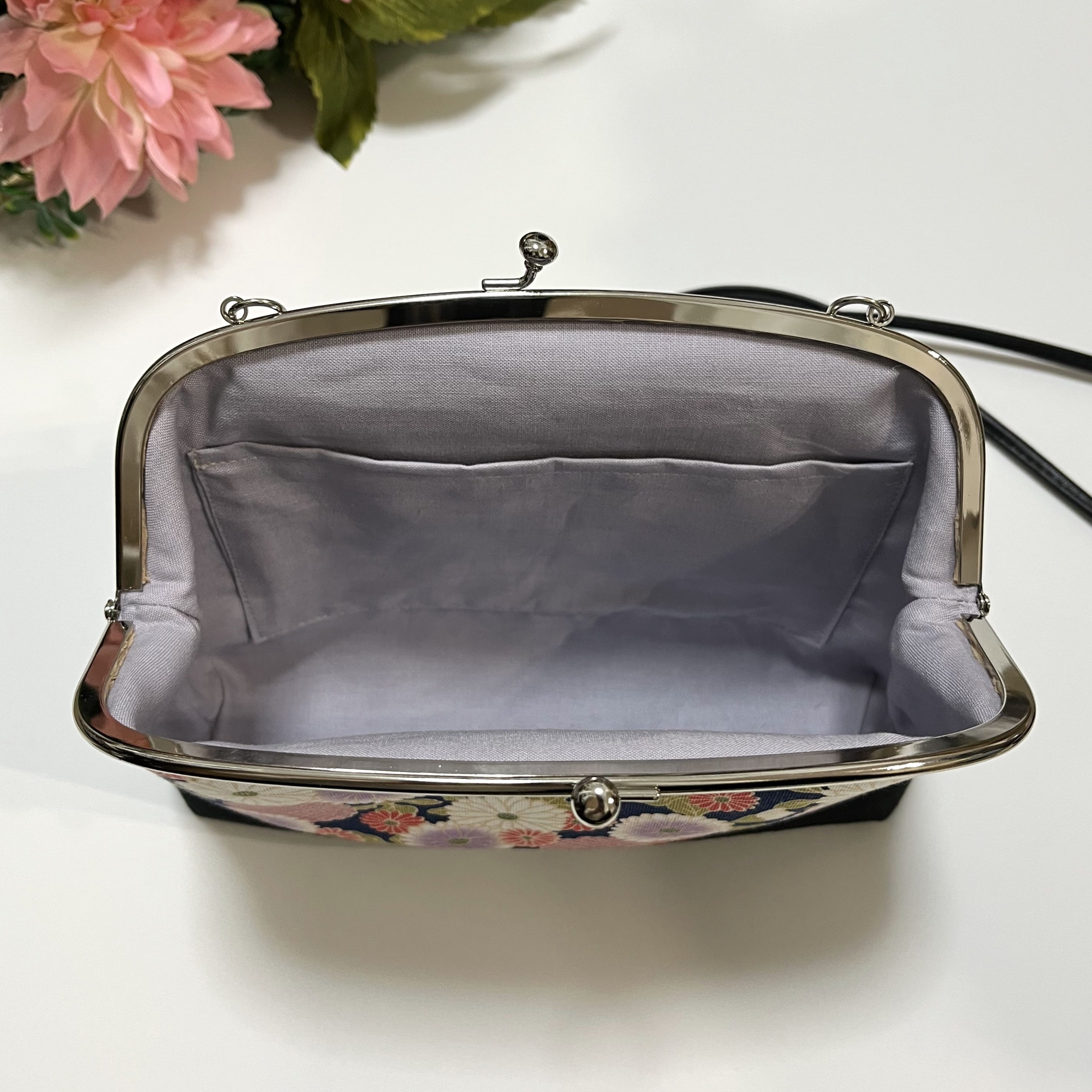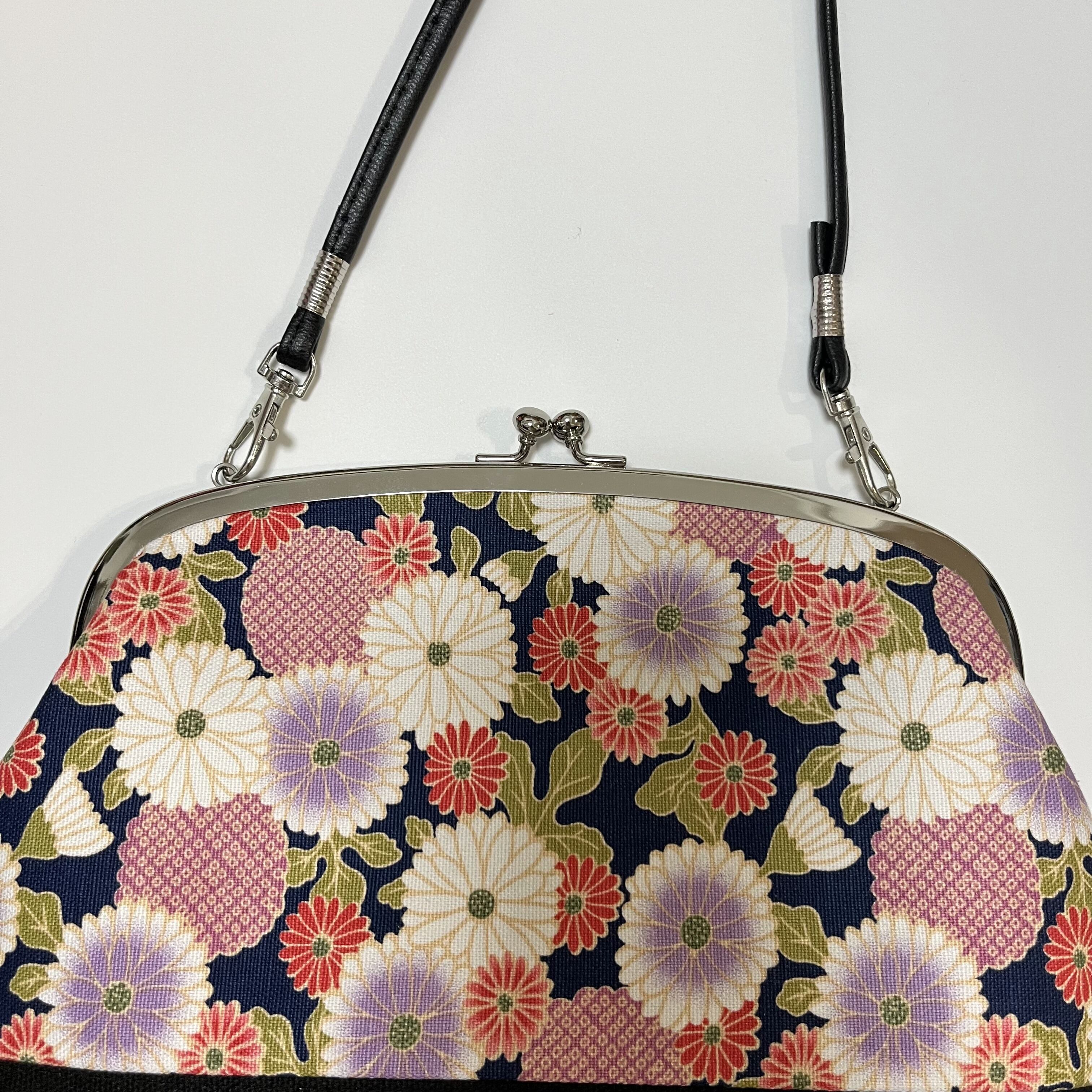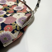 上品な菊が描かれた和柄生地に帆布を合わせたがま口ポシェットです。