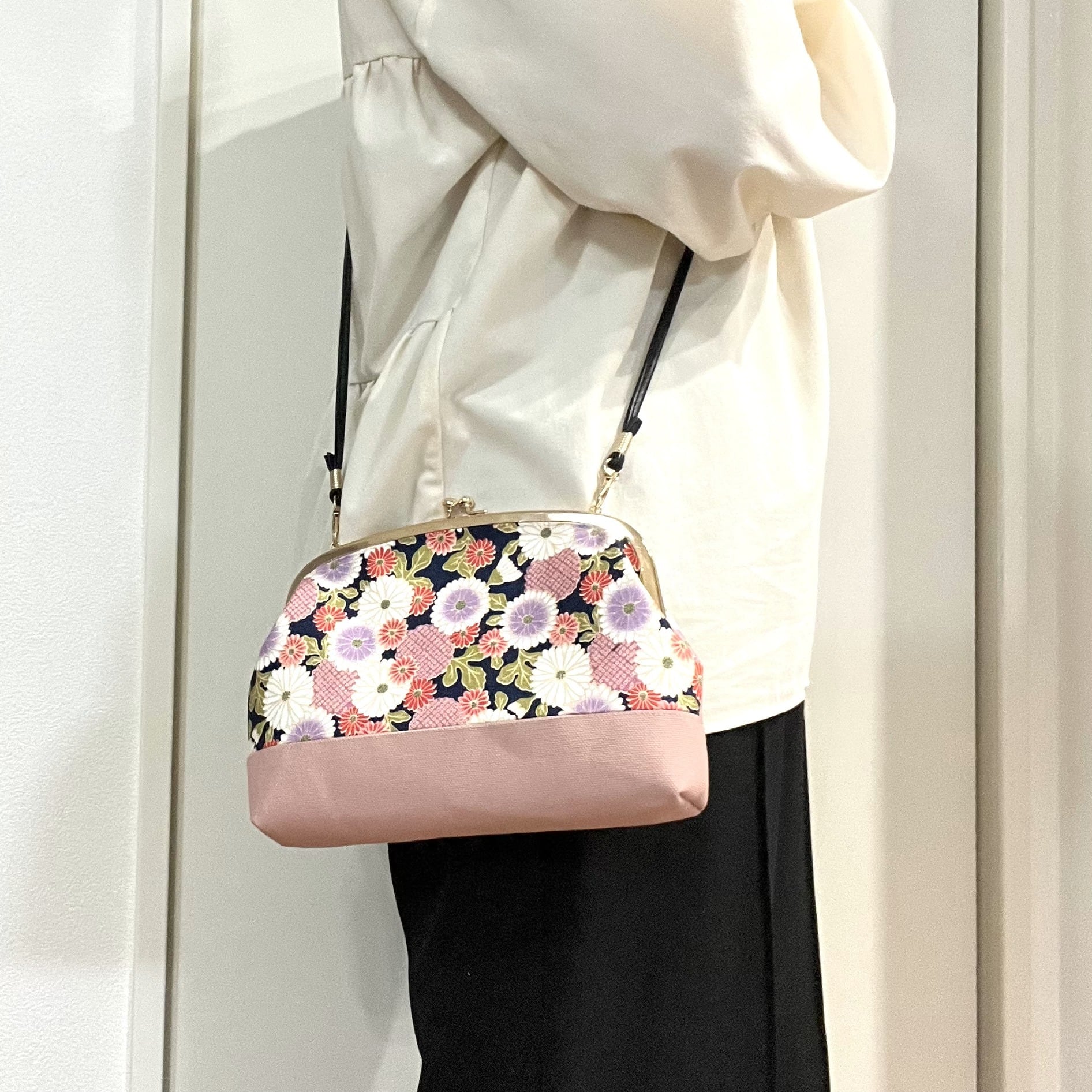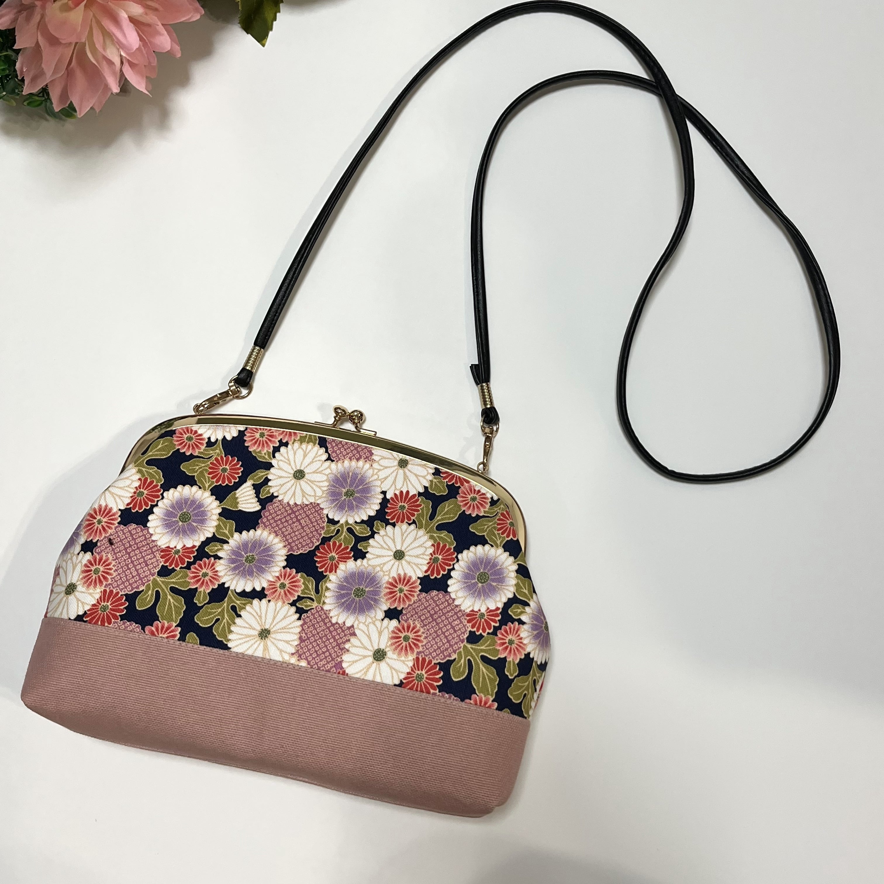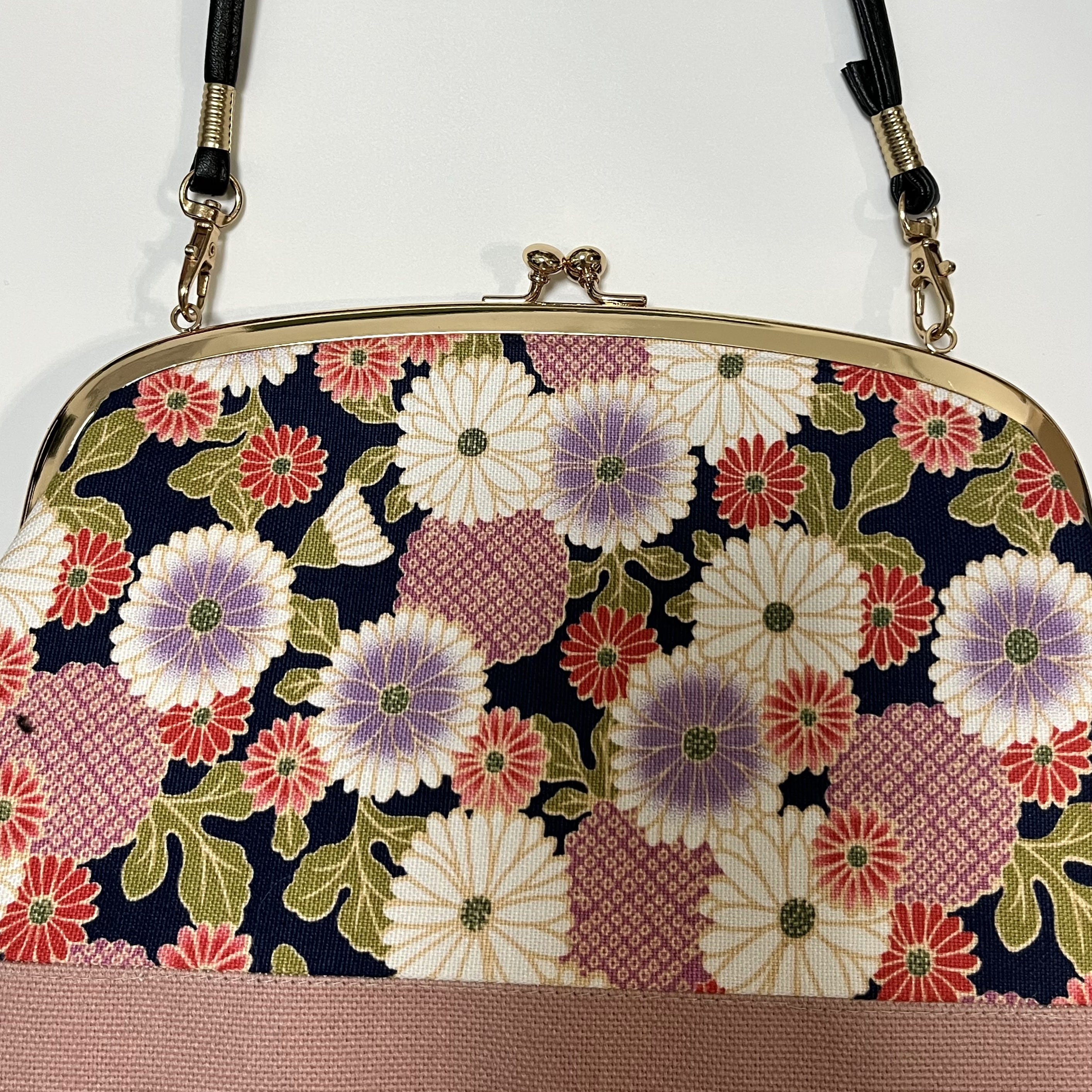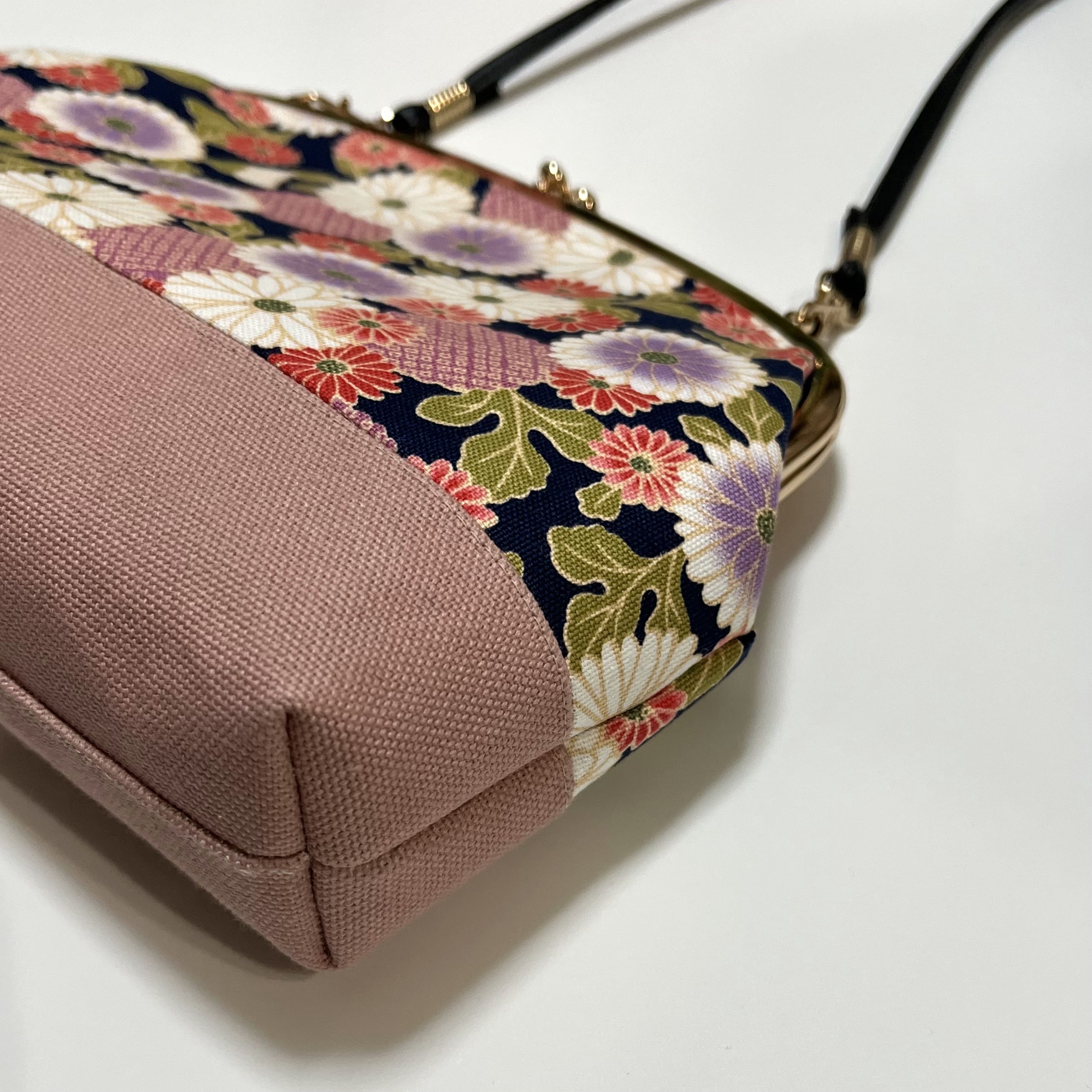 【wawaFAB】がま口ポシェット 帆布ピンク×菊 がま口ショルダーバック