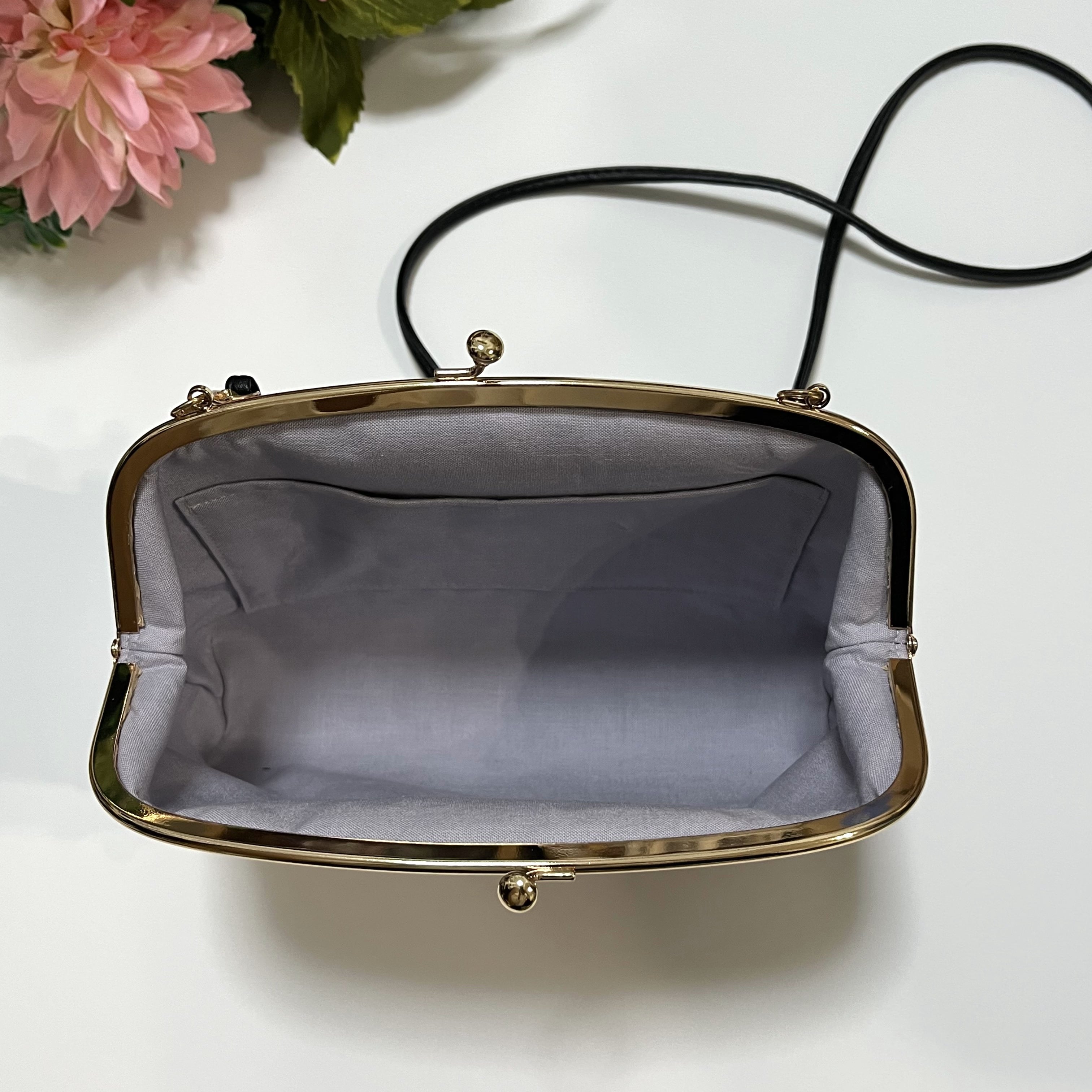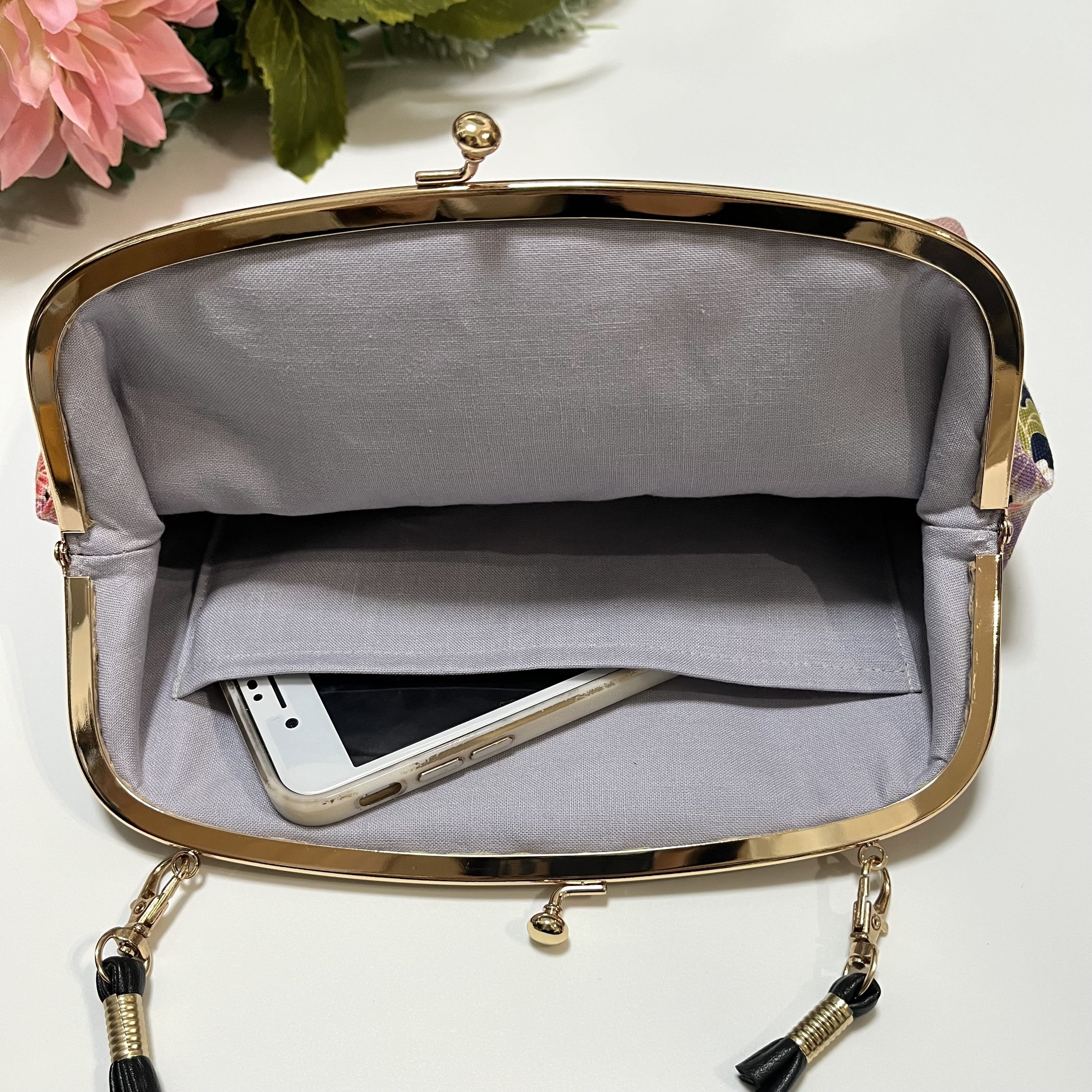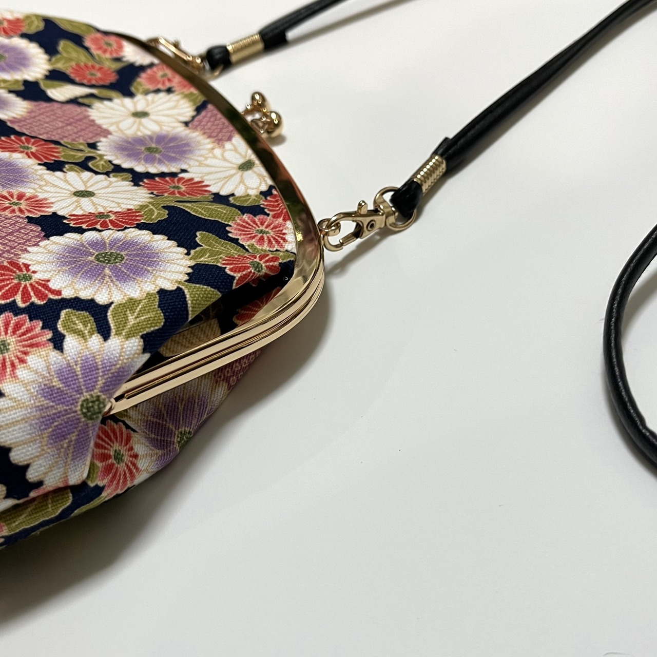 上品な菊が描かれた和柄生地に帆布を合わせたがま口ポシェットです。