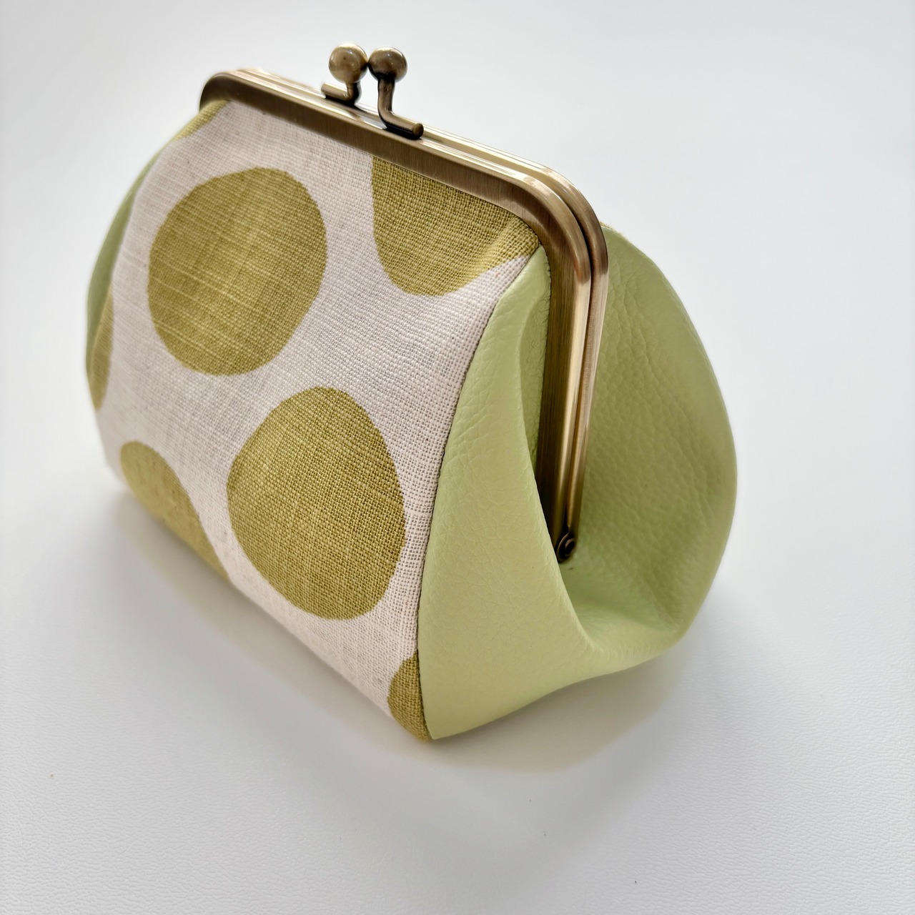 グリーンの落ち着いたニュアンスカラーで、マチの部分には合皮を使っています。